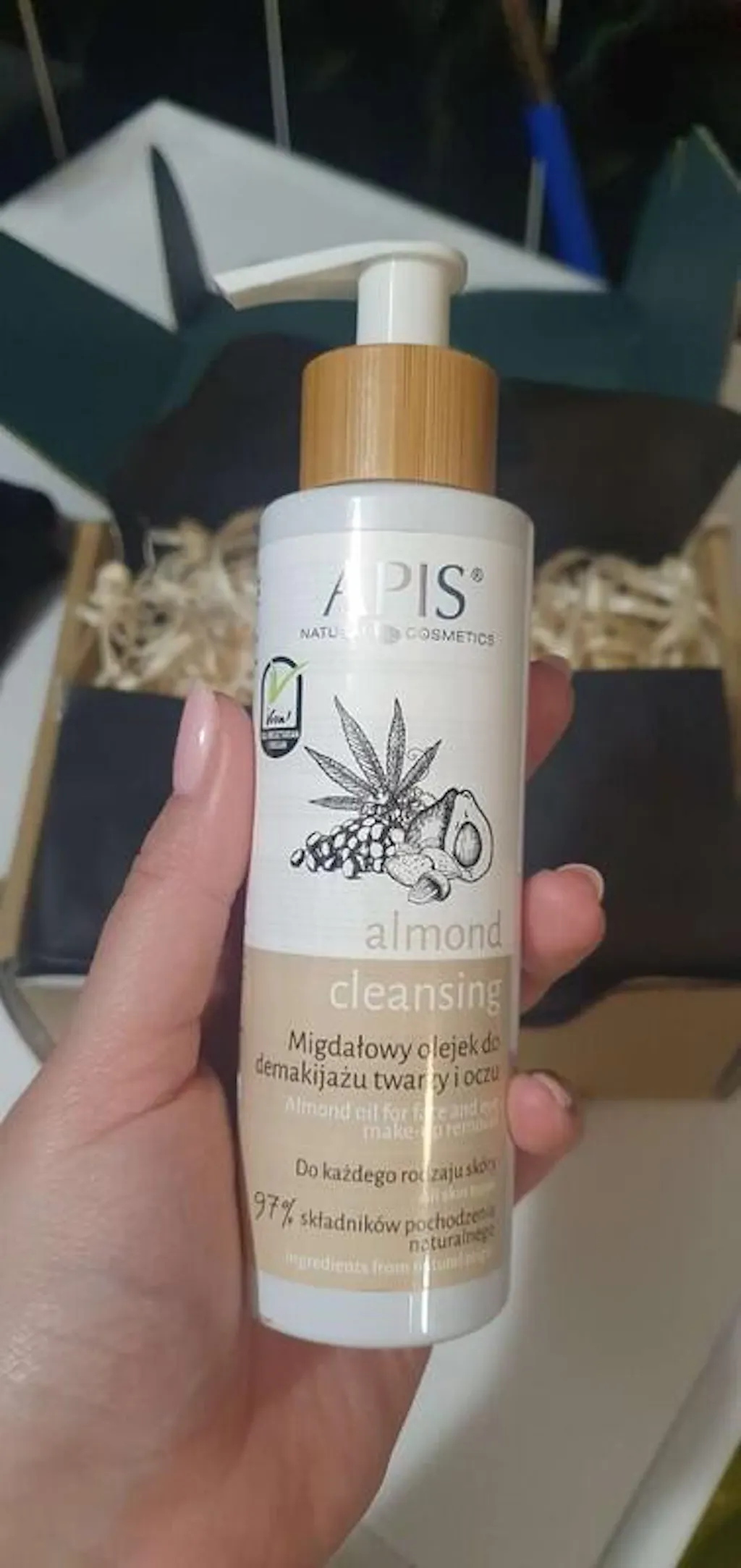 Mandelreinigungs-Apis-Mandelöl zum Entfernen von Make-up: *Vitis Vinifera-Samenöl, *Prunus Amygdalus Dulcis-Öl, *Crambe Abyssinica-Samenöl, *Cannabis Sativa (Hanf)-Samenöl, *Persea Gratissima-Öl, *Olivenöl PEG-8-Ester, *Cucurbita Pepo-Samenöl, *Tocopherol, *Helianthus Annuus (Sonnenblumen)-Samenöl, *Coco-Caprylat/Caprat, **D-Panthenol, **Benzylalkohol, **Salicylsäure, *Glycerin, **Sorbinsäure, **Parfüm